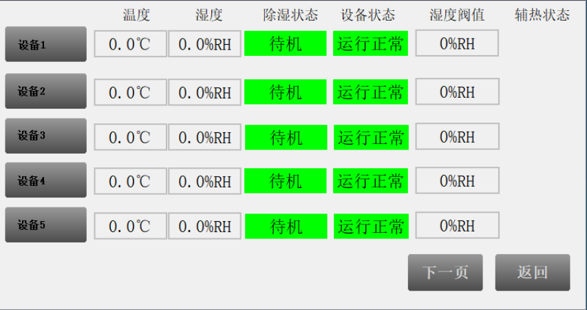 智能除湿装置监控主机主要用于智能除湿装置的集中查看与控制,可直接在主机上对集控的装置进行包括:温湿度数据、运行状态的查看,开启和取消设备的强制运行状态,湿度启动阀值、辅热开启阀值设置等功能的操作。