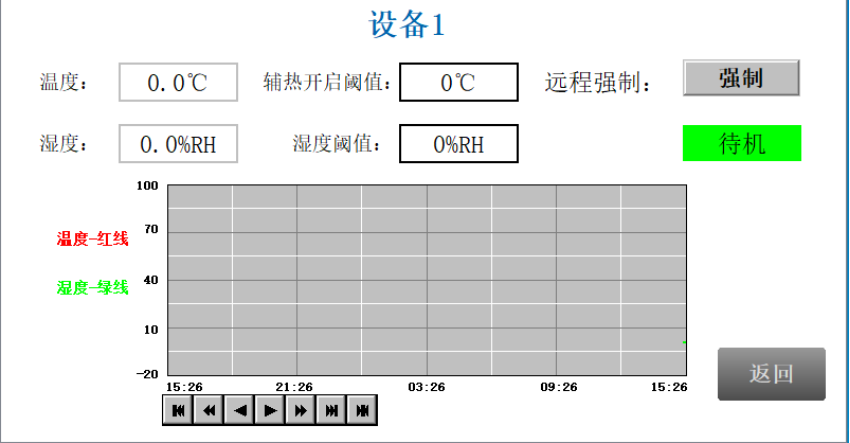 启动或停止除湿装置强制运行模式。还可以查看除湿装置的目前温湿度值,历史温湿度曲线和运行状态等。