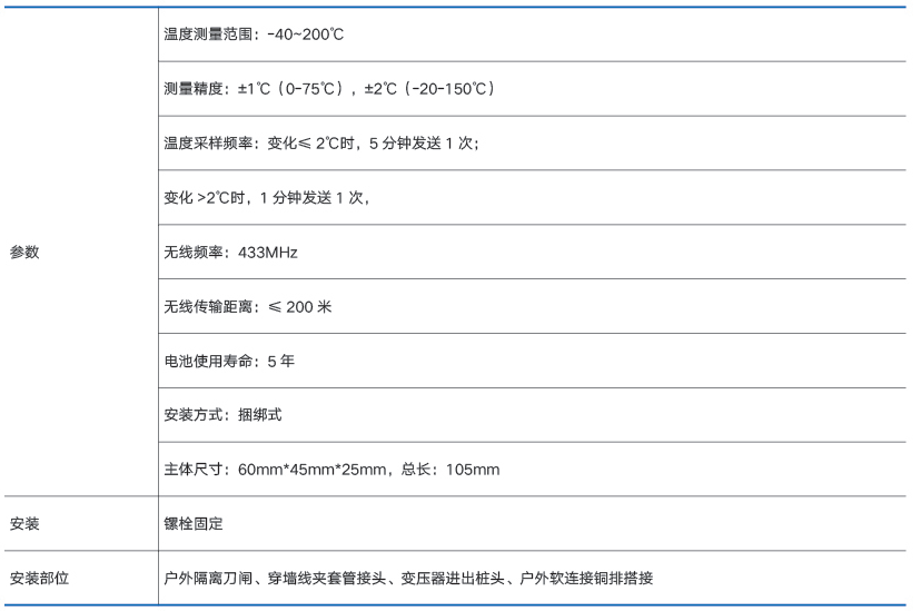 本系列无线测温传感器用于测量高压带电物体表面或接点处的温度,如高压开关柜内的裸露触点、母线连接处、户外刀闸及变压器等的运行温度。无线温度传感器是由温度传感器、信号调理放大、逻辑控制电路、无线调制接口等组成,传感器将采集到的温度信号通过无线网络发送到无线式温度监测仪。