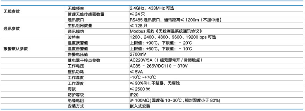产品描述:本无线测温接收器适用于:断路器触头测温、母排测温、母线测温、变压器测温、电缆搭接头测温、电缆槽测温等从0.4KV到110KV的高低压电力设备,是一款全新技改项目使用的无线测温装置。